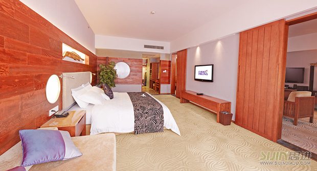 廣州長(zhǎng)隆酒店客房家具白虎房樣式:紋理清晰唯美的原木墻壁,行走在與之相呼應(yīng)的紋路毛毯,觸摸那繡上雪虎花紋的被褥,你是否也有一種走進(jìn)了高貴雪虎所生長(zhǎng)的森林似的錯(cuò)覺?