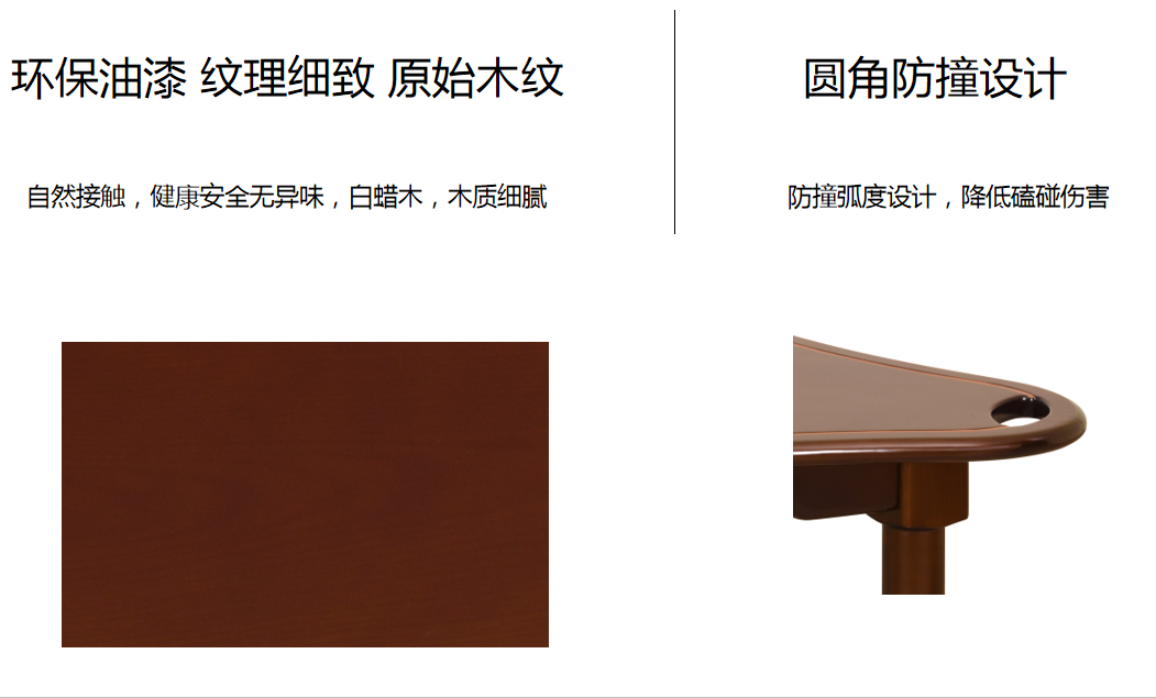 餐桌 基材:為實(shí)木白蠟?zāi)究蚣芙Y(jié)構(gòu) 臺(tái)面凹位設(shè)計(jì),便于輪椅長(zhǎng)者就餐 四角設(shè)有助力拉手孔,便于借力 桌角大圓角設(shè)計(jì),減低碰撞傷害,拆裝結(jié)構(gòu),便于運(yùn)輸。