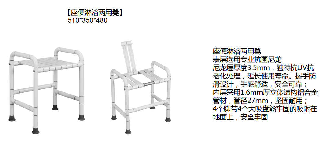 座便淋浴兩用凳 表層選用專業(yè)抗菌尼龍 尼龍層厚度3.5mm,獨(dú)特抗UV抗老化處理,延長(zhǎng)使用壽命。握手防滑設(shè)計(jì),手感舒適,安全可靠; 內(nèi)層采用1.6mm厚立體結(jié)構(gòu)鋁合金管材,管徑27mm,堅(jiān)固耐用; 4個(gè)腳帶4個(gè)大吸盤(pán)能牢固的吸附在地面上,安全牢固